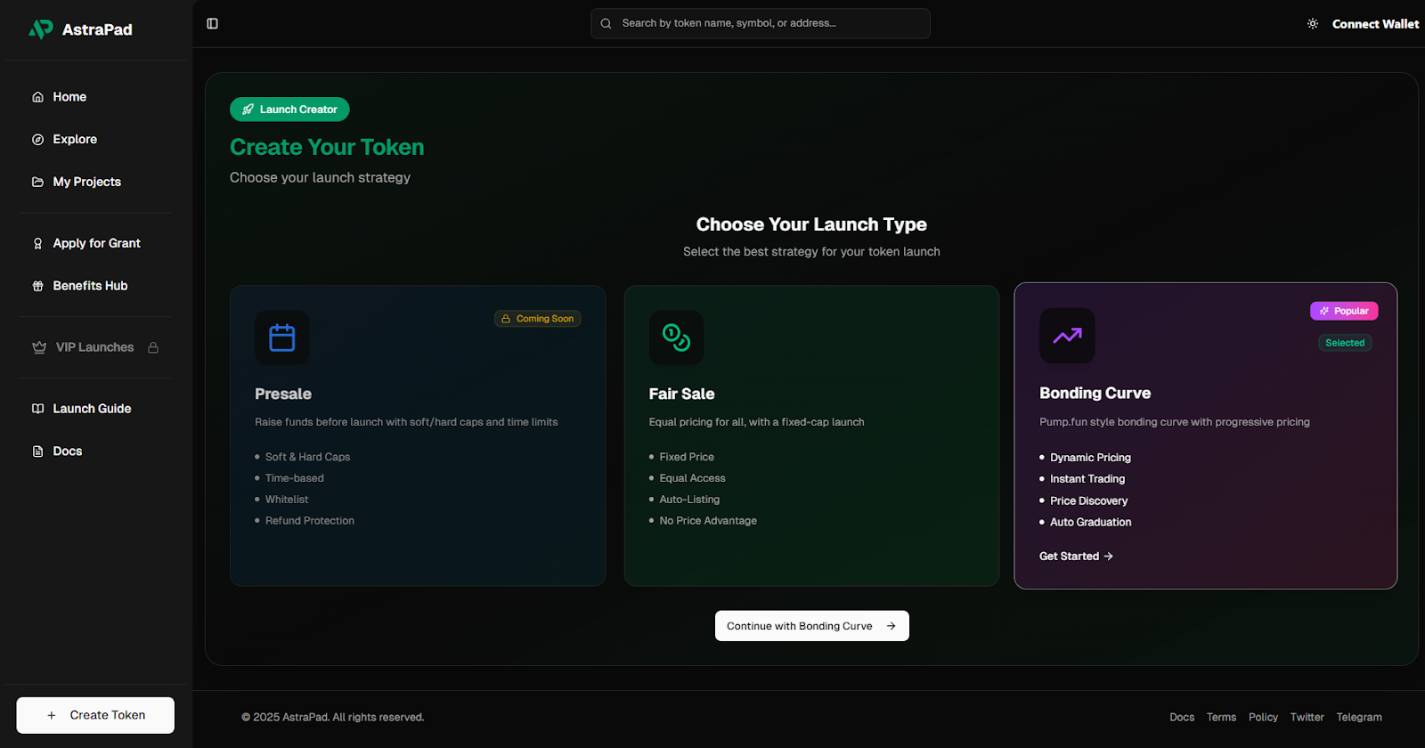1. Choose your preferred launch model — Fair Sale or Bonding Curve.