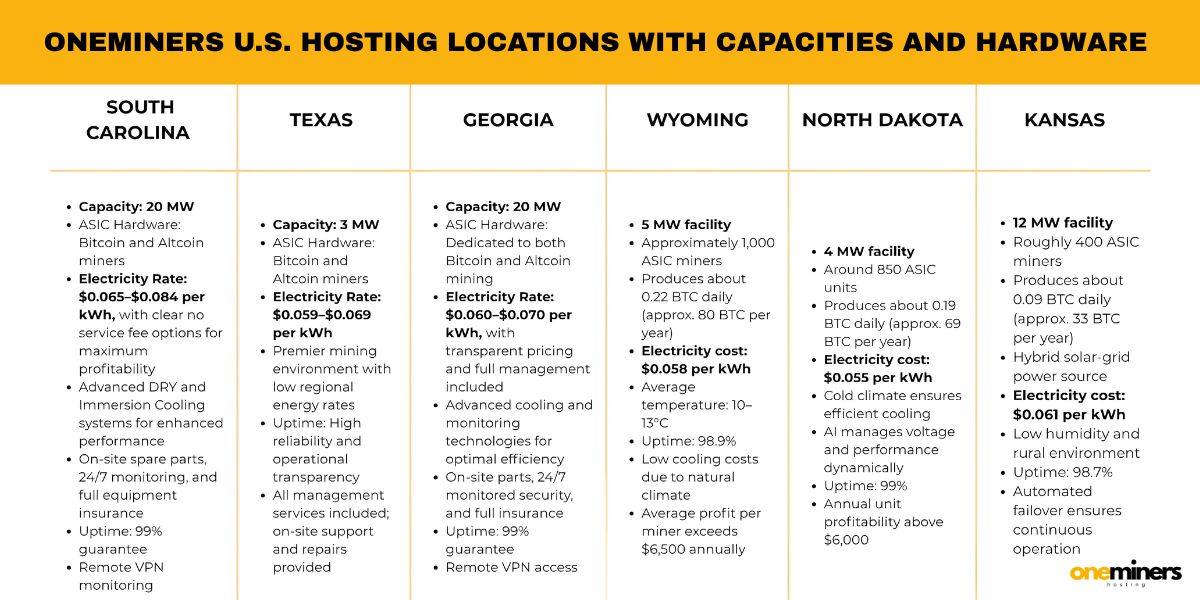 These centers are positioned in South Carolina, Texas, Georgia, Wyoming, North Dakota, and Kansas, regions selected for cost-efficient electricity, ranging from $0.055/kWh in North Dakota up to $0.070/kWh in Georgia. Climate-optimized environments and a strong renewable energy mix allow OneMiners to deliver consistently high profitability and reliable uptime for hosted miners.